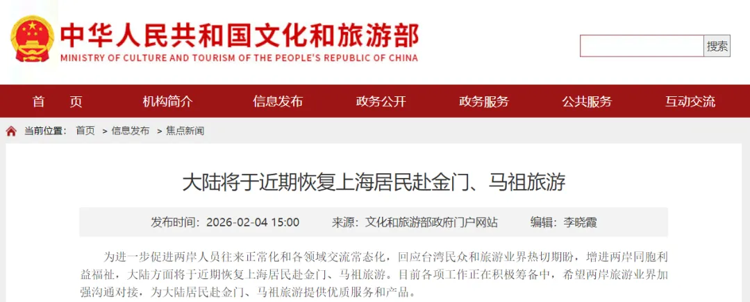 文旅部:近期将恢复上海居民赴金门、马祖旅游